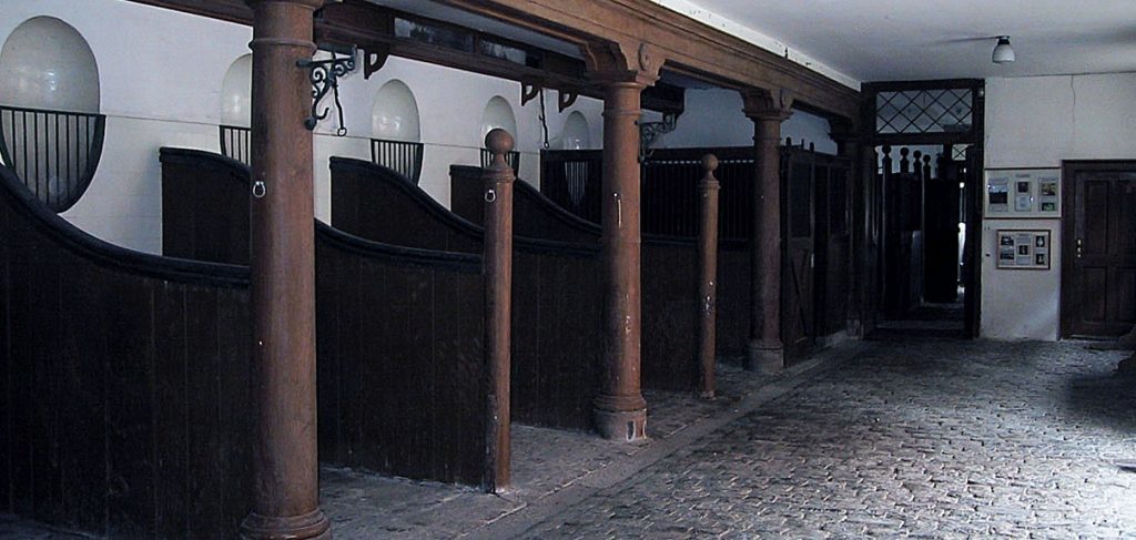 Staldene er bevaret i deres oprindelige stil med båse, trug og bjælker, så man næsten kan høre hestenes hove mod de toppede brosten i gulvet.