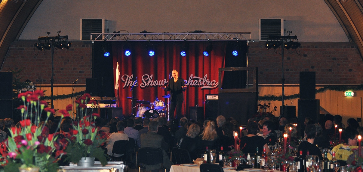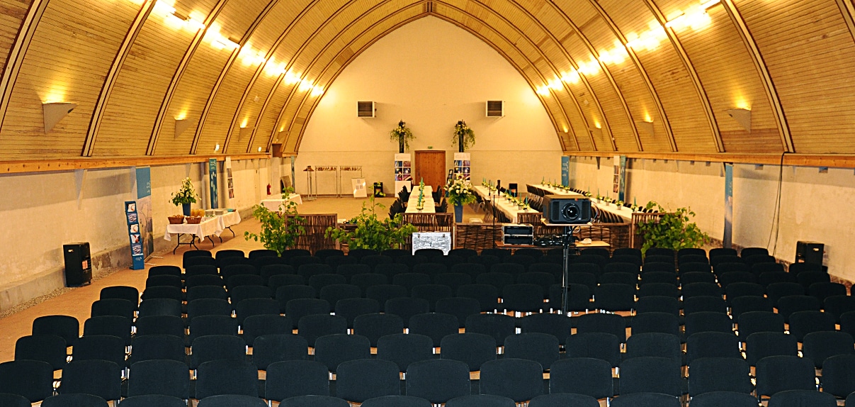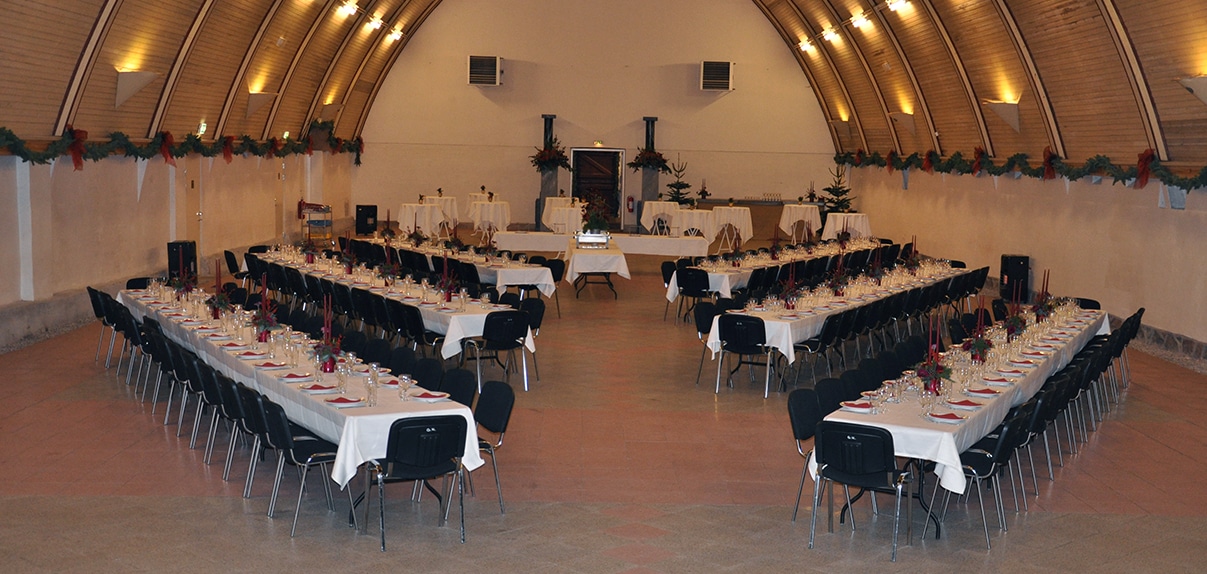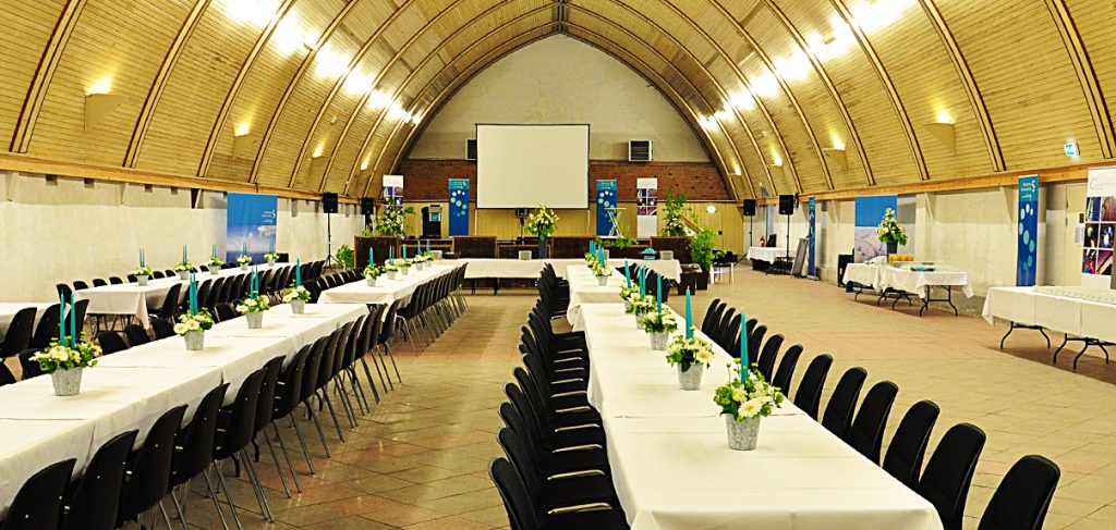 Peder Oxe Hallen har plads til 550 siddende gæster på rækker eller 400 gæster ved bordopdækning.